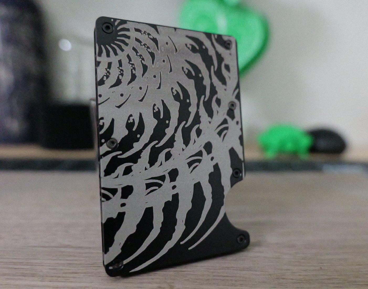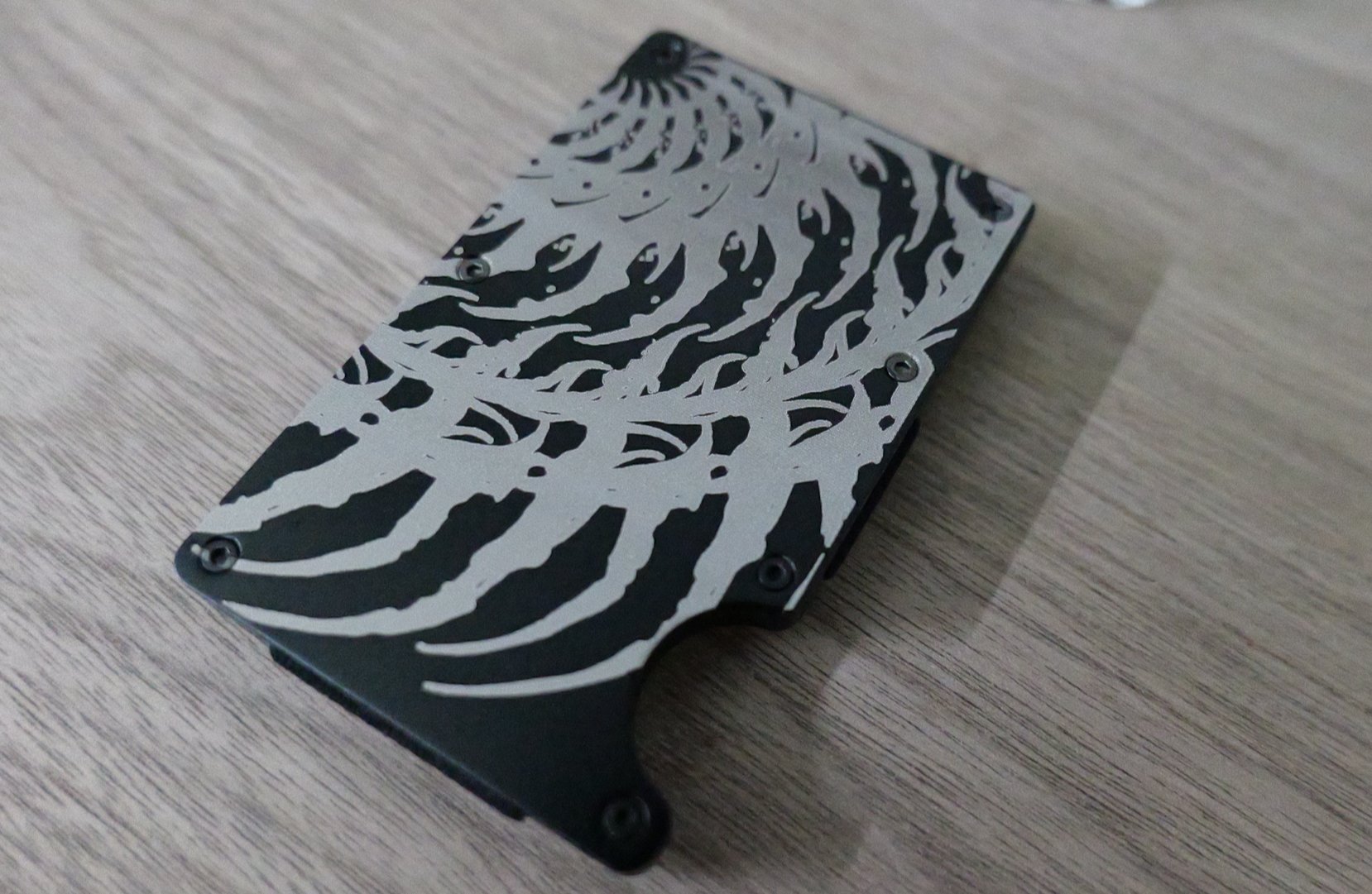 Metal clip wallet with a custom Darkdala design. Easily h olds up to 5 cards.