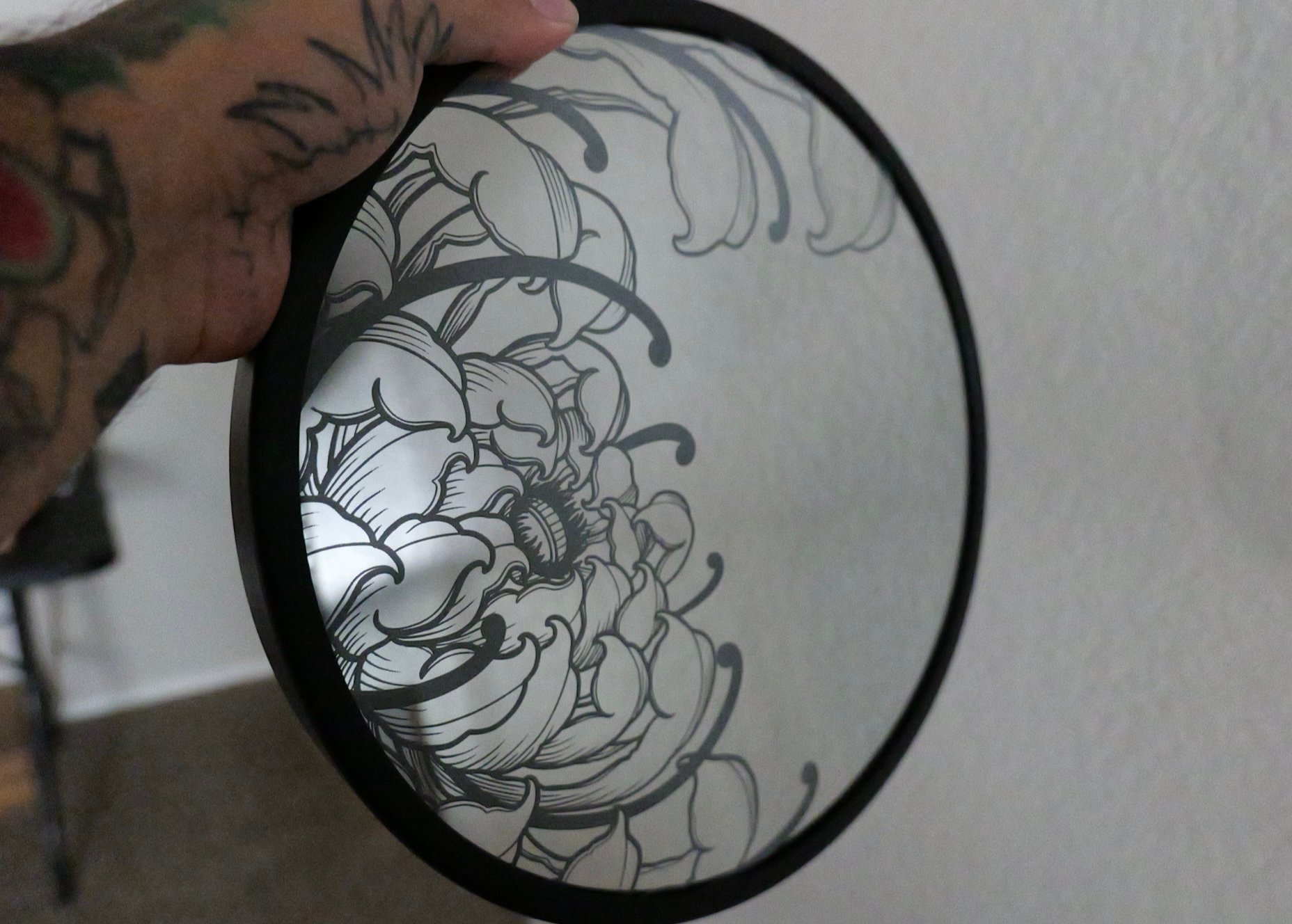 This 12” mirror with a custom design will shock anyone that walks by it.